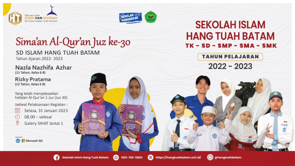 Assalamu’alaikum Warahmatullahi Wabarakatuh. Selamat Datang di Website Sekolah Islam Hang Tuah Batam Sebagai lembaga pendidikan yang menyiapkan generasi emas dan tanggap dengan perkembangan teknologi dan perkembangan zaman. “Didiklah anakmu sesuai dengan zamannya”